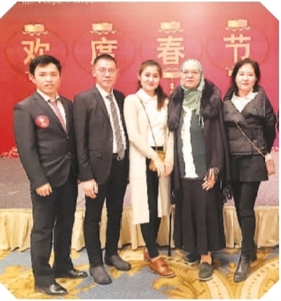 马志山(左一)与导师纳希德·阿尔沙拉维(左四)参加二〇一九中国驻亚历山大总领馆新春招待会。