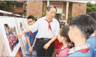 7月3日,为弘扬“中国少年先锋队队歌”精神、传承红色基因,“英雄小八路精神图片展”进校园首场巡展在福建厦门启动。据悉,1958年“八·二三”炮战爆发,当时的厦门市禾山第四,小学成立了前线少年支前活动大队,冒着生命危险支援前线。根据其事迹于1960年10月拍摄的电影《英雄小八路》主题歌《我们是共产主义接班人》,于1978年10月被确定为中国少年先锋队队歌。图为厦门市教育基金会理事长潘世建在为小学生们讲当年的故事