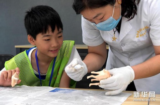 8月1日,在洛阳市文物考古研究院文物保护修复,,工作人员帮助“我是小小考古家”夏令营的营员模拟体验修复“文物”。 新华社记者 李安 摄