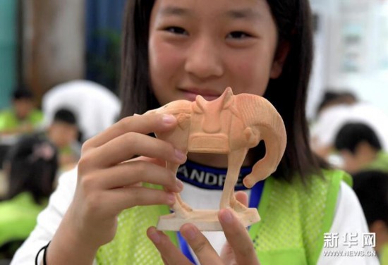 8月1日,在洛阳市文物考古研究院文物保护修复,,一名“我是小小考古家”夏令营的营员在展示她修复好的“文物”。 新华社记者 李安 摄