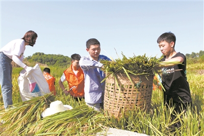 8月15日,受资助的大学新生在稻田里搬运稻谷。重庆市永川区吉安镇今年有70多名受资助的学生考上大学,开学前夕,当地组织他们开展“感恩祖国,回报社会”主题活动。受资助大学新生在稻田里挥镰割稻、搬运稻谷,以实际行动回报社会的关爱。(陈仕川)