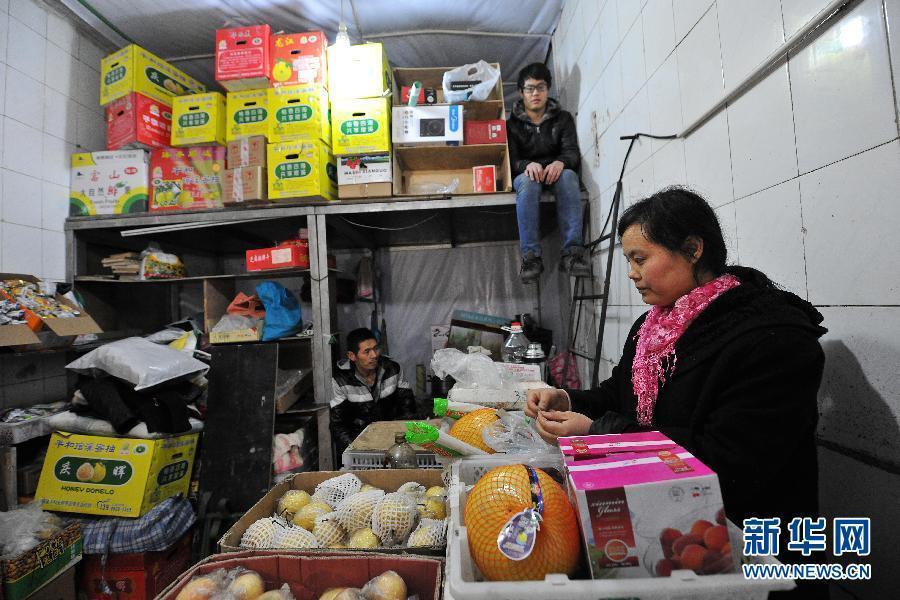 明亮水果店位于阳泉市山西工程技术学院,王亮明和妻子贾润明及放寒假回家的儿子王帅每天整理水果、干果等待顾客。店里隔出一个约4平方米的区域,摆着一张小床和灶台,床上用隔板搭起二层,晚上收摊后,儿子睡二层,王亮明和妻子在下面休息——小店俨然变成一家三口的“家”。