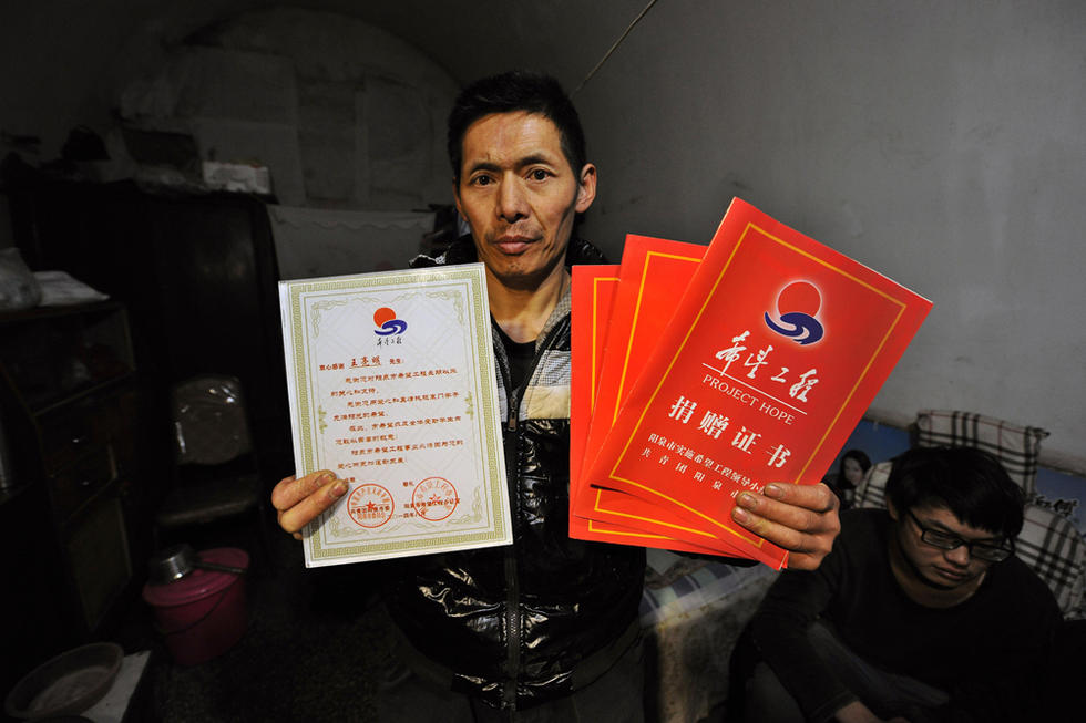 “我学上得不多,可我很喜欢读书。现在有了一点能力,就应该帮助那些上不起学的孩子。” 王亮明说,下一步争取扩大水果店,多挣一点钱,就能帮助更多渴望上学的贫困孩子。 王亮明拿着阳泉市希望工程办公室颁给他的证书(2月2日摄)。新华社记者 詹彦 摄 图片来源:新华网