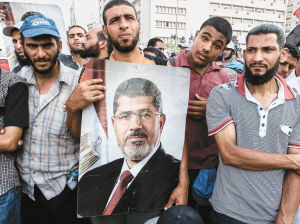 7月6日,在埃及开罗纳赛尔城的共和国卫队俱乐部外,穆尔西支持者手持穆尔西海报示威。当日,仍有上千名穆尔西支持者聚集在埃及共和国卫队俱乐部外示威。5日午后,在位于开罗的共和国卫队俱乐部外一些示威者与士兵发生争执,随后士兵开枪,导致至少3名示威者当场死亡。(新华社记者 李木子 摄)