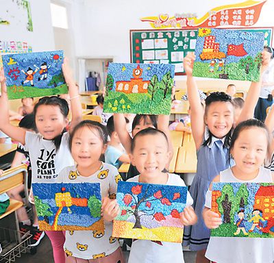 近日,在山东青岛杭州路小学开学第一课上,一年级新生通过环保纸浆画描绘出科技、宇航、环境保护等内容,在绘画中表达对未来的憧憬,迎接开学季。(摄影:王海滨)