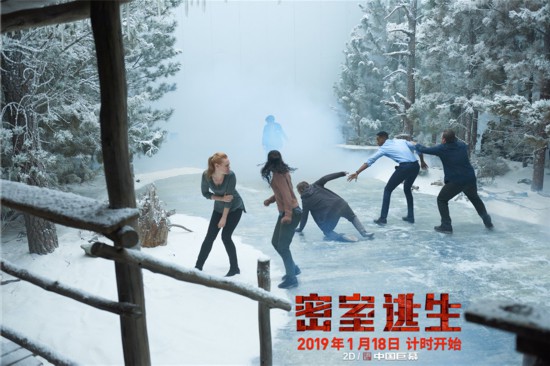 电影《密室逃生》10日发布“冰面陷落”原片片段,密室逃生之路,出现生命危机!预告中,六位主角在极寒环境下,终于找到逃生钥匙,但钥匙却被冰封在巨大的冰块中,希望被瞬间浇灭。而玩家之一的本正好有一支打火机,正当丹尼去拿时,危险降临,冰面瞬间裂开,丹尼不慎掉进湖底。