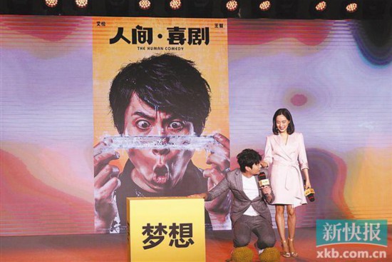 喜剧电影《人间·喜剧》24日在京举行“生活不易,人间有戏”发布会,主演艾伦、王智、鲁诺、潘斌龙集体亮相。几位主演通过人生骰子做出选择与挑战,艾伦甚至在现场完成了真实版“跪榴莲”,他也感谢导演终于让自己娶到了女神“秋雅”。