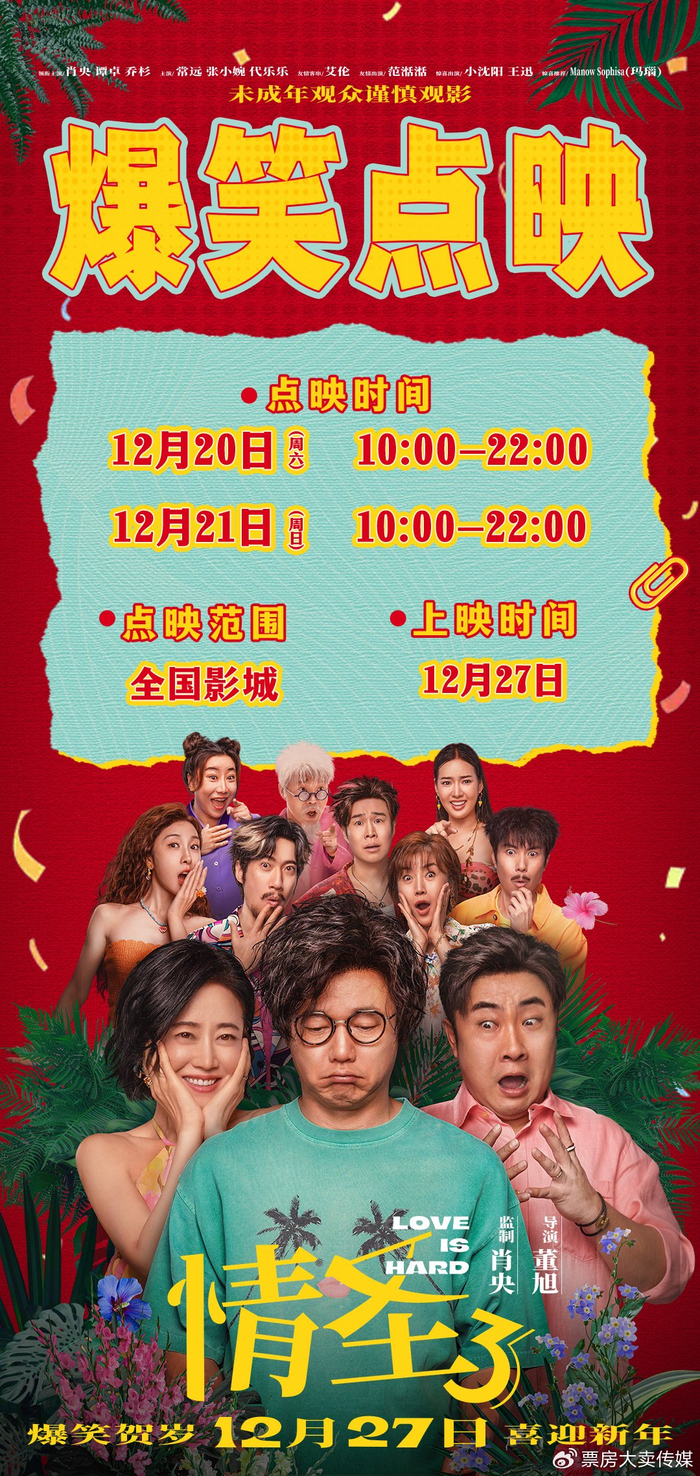 由肖央监制,董旭执导的爆笑喜剧电影《情圣3》今日官宣定档12月27日全国上映,并于12月20开启全国点映,同时也正式曝光定档预告与定档海报。影片由肖央、谭卓、乔杉领衔主演,常远、张小婉、代乐乐主演,艾伦友情客串,范湉湉友情出演,小沈阳、王迅惊喜出演,Manow Sophisa(玛瑙)惊喜推荐。电影《情圣3》讲述了结婚十五年的中年夫妻田绍基(肖央 饰)与邵美珍(谭卓 饰)感情即将“熄火”,阴差阳错下两人整活儿不断,花招不停,“爱情三十六计”轮番登场,一连串好戏接连上演,情场大战大爆笑!影片将于12月27日全国上映,12月20日开启全国点映,夫妻过招,笑闹开演!