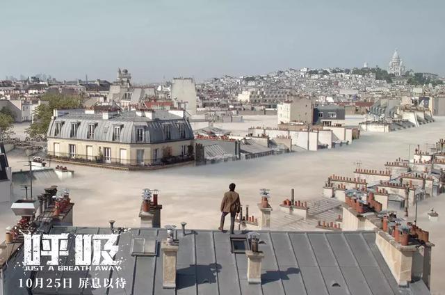 今日曝光的“屏息以待”定档海报中,男主角马蒂厄独自站在屋顶上,面前是已被迷雾覆盖的巴黎。往日繁华的街道已经无处可见,映入眼帘的只剩城市中即将被浓雾全部覆盖的一座座屋顶,只有远处的,建筑——埃菲尔铁塔还能依稀露出大概的轮廓。天空压下的乌云和地面浮起的迷雾将人们的生存空间压成一条细缝,让人喘不过气,压迫感十足。