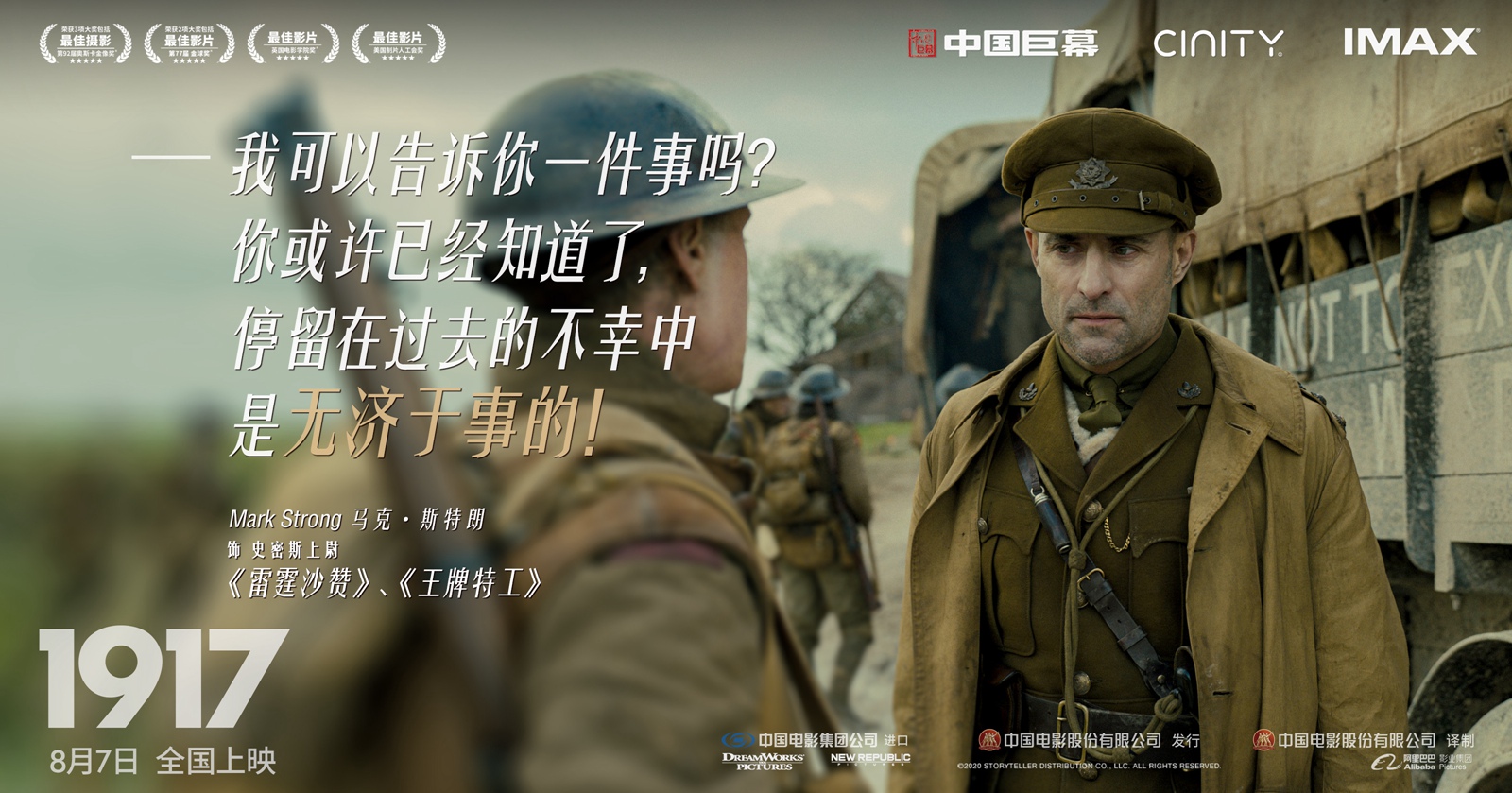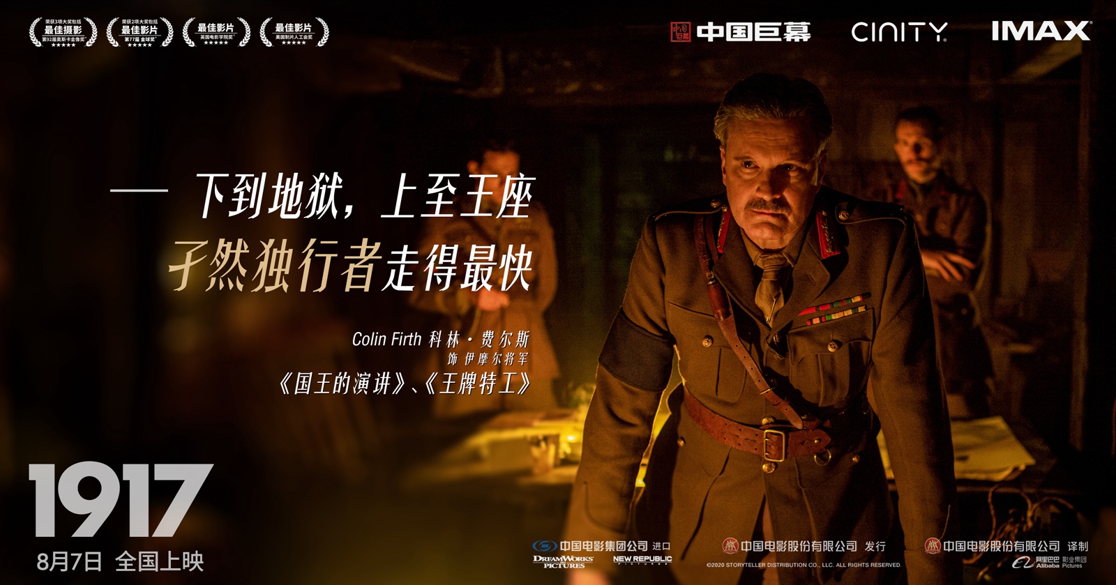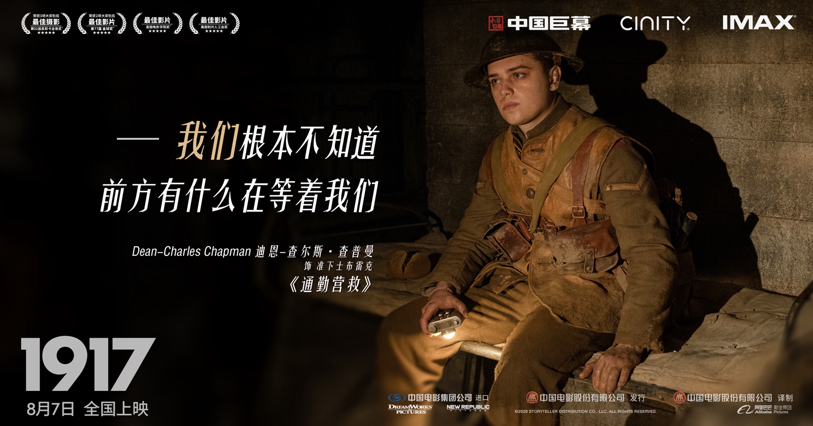 电影《1917》由美国梦工场影片公司、美国信实娱乐公司出品,中国电影集团公司进口,中国电影股份有限公司发行、译制,上海阿里巴巴影业有限公司协助推广。这也是阿里影业继《绿皮书》《何以为家》《徒手攀岩》后,协助推广的又一奥斯卡热门佳片。本片由萨姆·门德斯执导,乔治·麦凯和迪恩-查尔斯·查普曼领衔主演,将于8月7日正式登陆全国院线与观众见面!