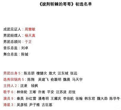 20日,网曝《披荆斩棘的哥哥》初选名单,导师团队有周慧敏、杨天真、于正[微博]、刘卓、陈铖,选手则包括: