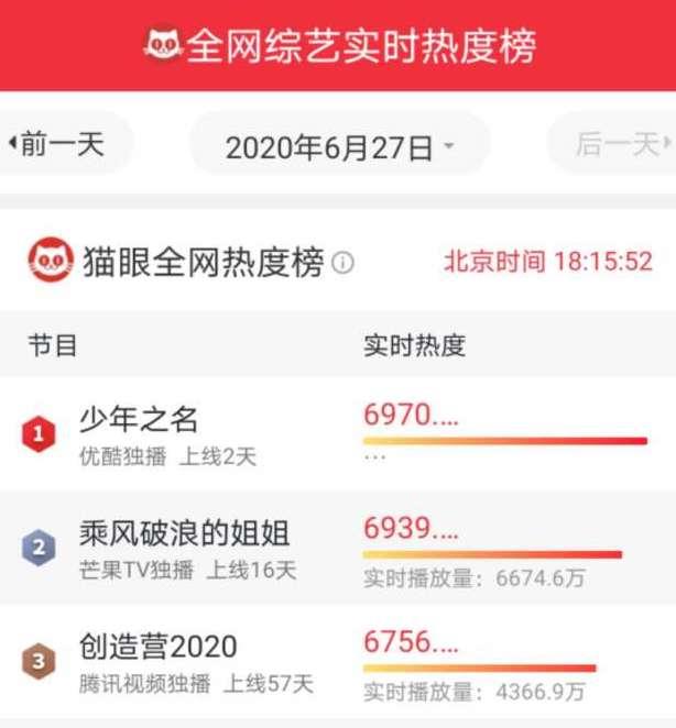 优酷出品的记录当代少年青春逐梦同行成长的综艺节目《少年之名》,一发声就引发全网关注。84位少年的初舞台就是场残酷之战,不仅惊艳了少年探索者易烊千玺、少年制作人张艺兴、以及郭敬明、胡彦斌、程潇和韩宇在内的诸位导师,也让网友们大呼燃炸。开播34分钟弹幕量破10w,再创站内互动活跃度新高;各大平台霸榜,全网综艺播出热度第一(数据来源于猫眼),成为周五档又一热门综艺。