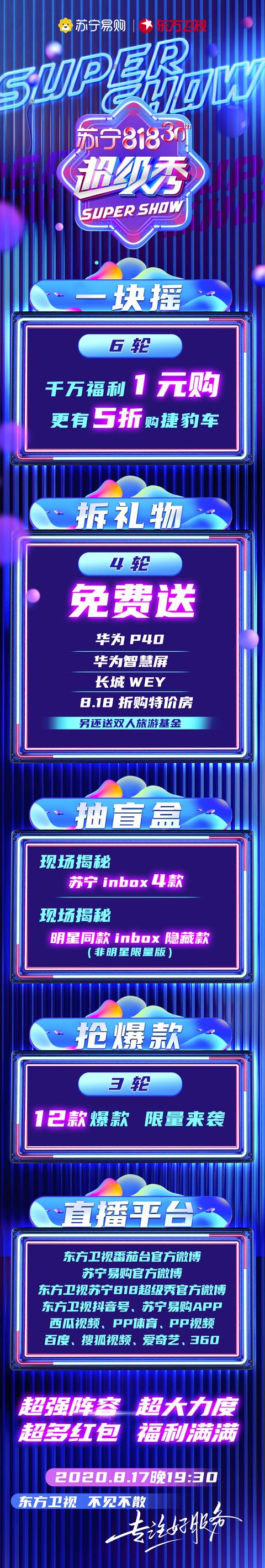 今晚19:30,东方卫视联手苏宁易购打造的综艺直播晚会818超级秀将迎来全球直播!阵容全盘升级,全程高能预警。818超级秀包含精彩绝伦的歌舞表演、欢乐搞笑的游戏互动以及创意无限的花式中插,更有超多福利限时折扣大放送。此次818超级秀除在东方卫视进行全球直播外,还将在东方卫视番茄台官方微博、苏宁易购官方微博,东方卫视苏宁818超级秀官方微博、东方卫视抖音号、苏宁易购APP、西瓜视频、PP体育、PP视频、百度、搜狐视频、爱奇艺、360等多平台进行同步直播。