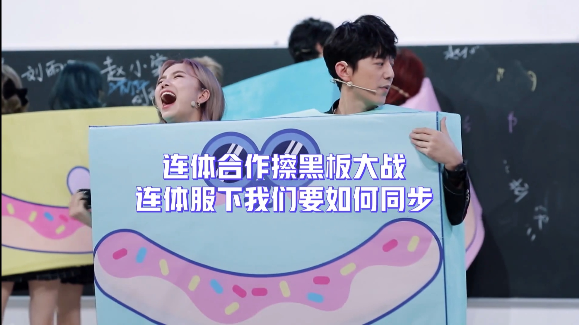 第二个游戏“连体合作擦黑板大战”则透露了节目最爆梗的环节之一,所有嘉宾两两配对套上连体玩偶服团队作战,用超嗨的的狂欢力为现场制造了最爆笑的氛围;