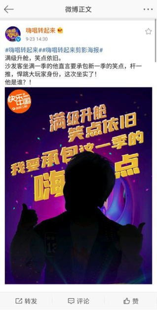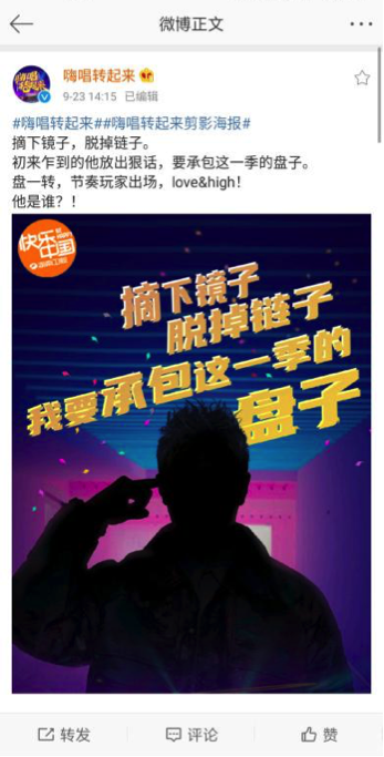 9月23日,《嗨唱转起来2》发布三张剪影海报,并配文:Ta是谁?虽然没有露脸,但眼尖的网友早已猜出三人分别为谢娜、潘玮柏、大张伟。