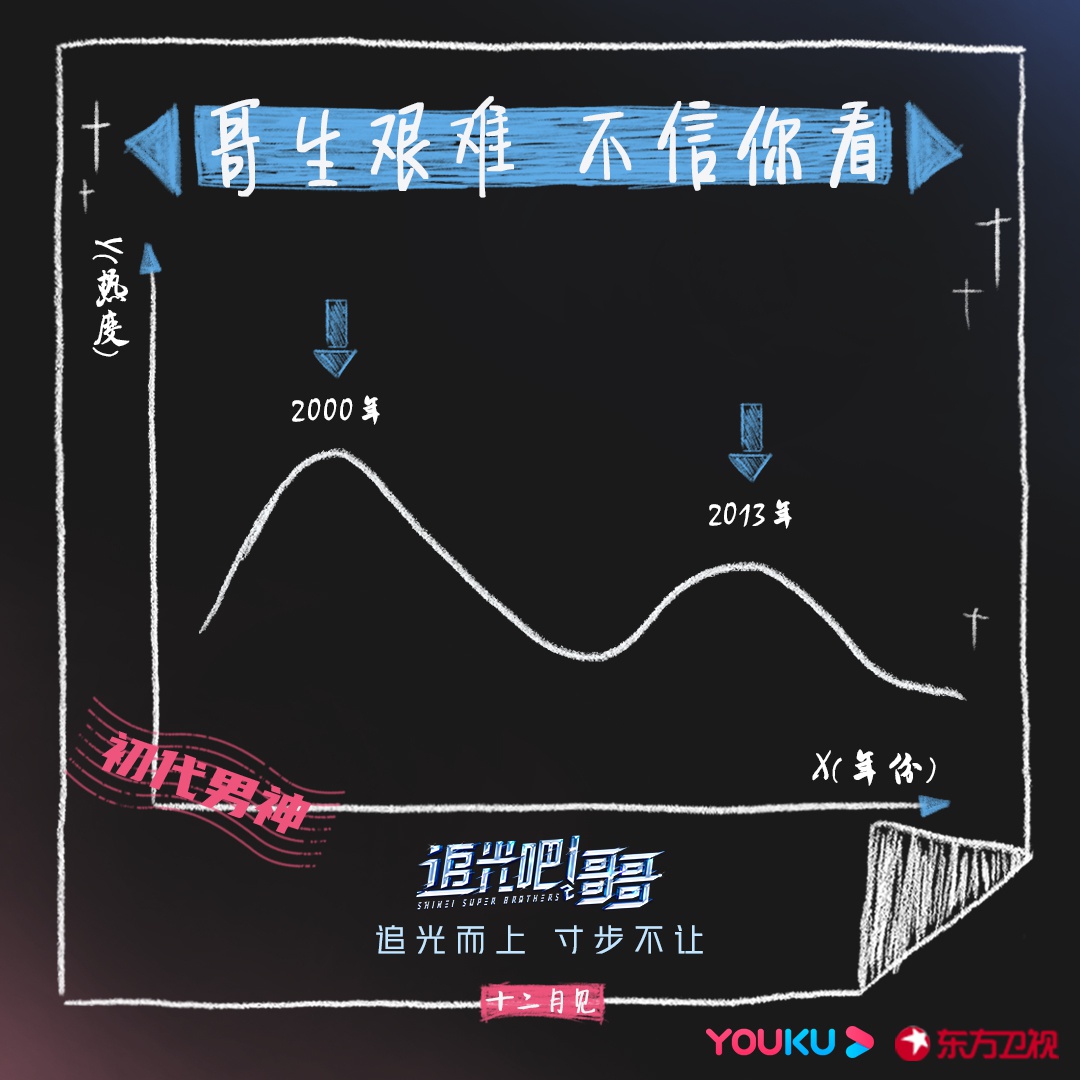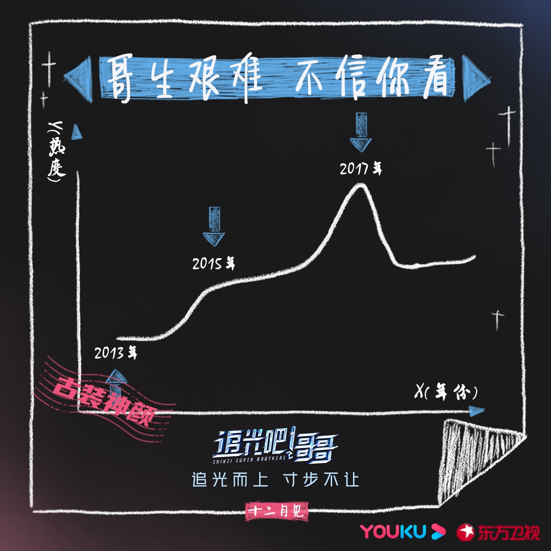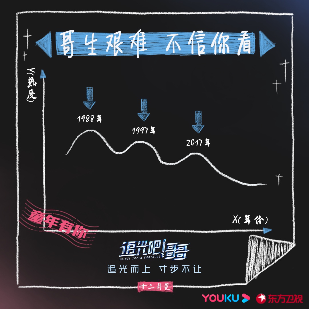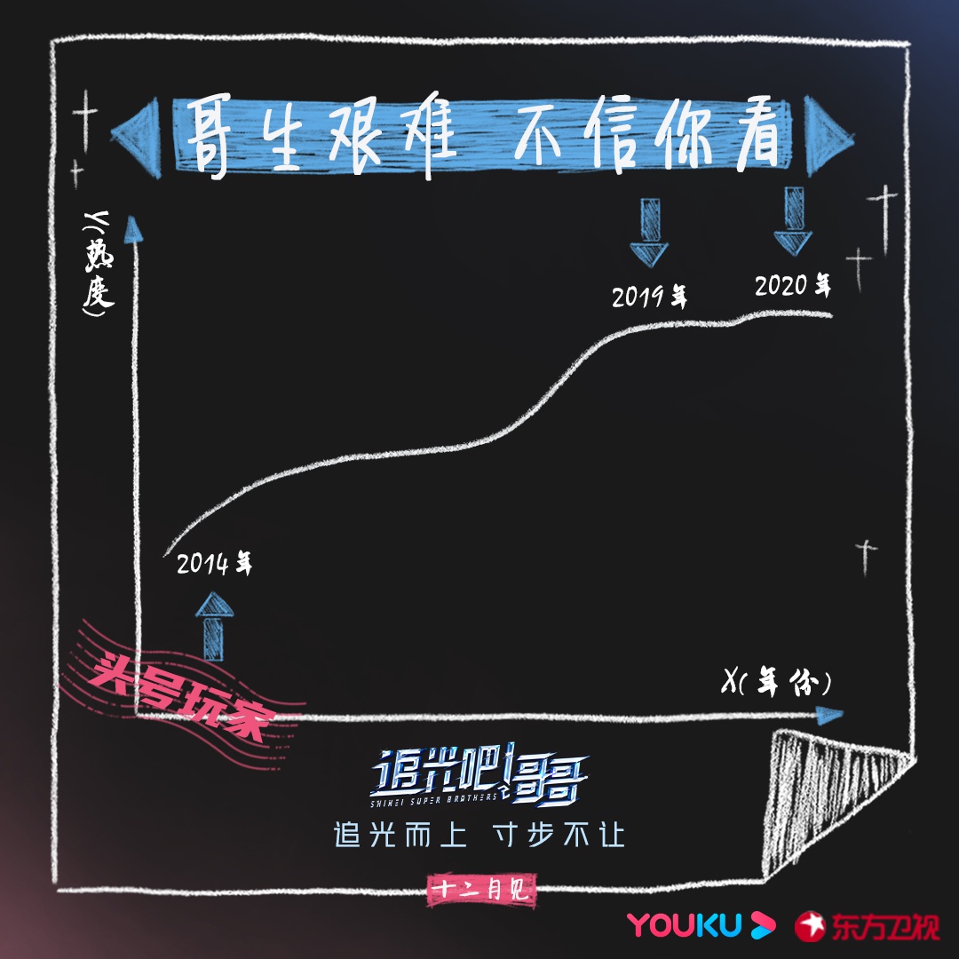 11月10日晚,优酷联合东方卫视、灿星制作重磅打造的国内首档混龄男团竞演真人秀《追光吧!哥哥》概念片在天猫双十一晚会上全新发布,超Man超励志的"哥哥宣言"令人热血沸腾。而刚刚公布的21位哥哥从艺生涯K线图,更是引发"全民猜哥"热潮,网友大呼《追光吧!哥哥》这种理科式官宣的方式很特别、很直男,但也真的好难猜,比算双十一减免还要费脑子。