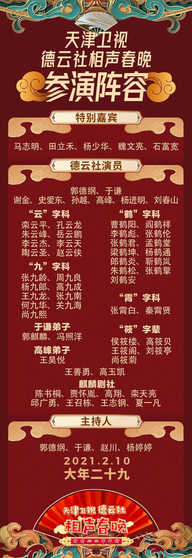 1月17日,2021年天津卫视德云社相声春晚在录制现场举办了媒体见面会,郭德纲携于谦、郭麒麟、栾云平、岳云鹏、孟鹤堂、周九良、秦霄贤出席,并正式对外官宣相声春晚阵容名单。
