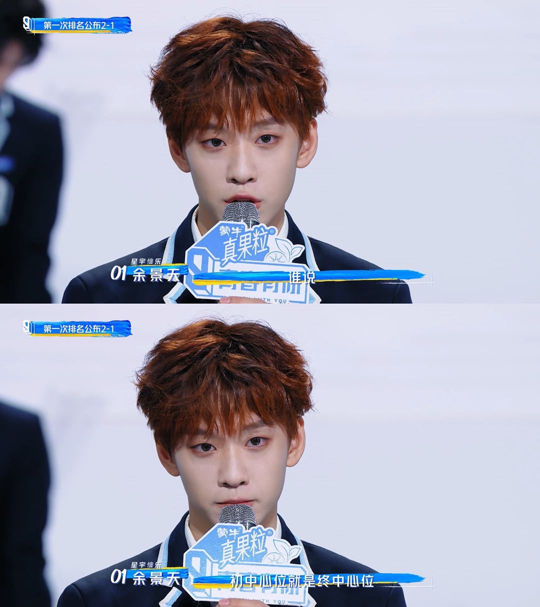 节目自开播以来,,的余景天在初舞台挑战自我、在“我想”舞台表达想法、在主题曲考核中克服压力,他一直都秉持着对观众负责的态度对待每一次舞台,也因此收获不少观众的好评,圈粉无数。在主题曲舞台的投票中,余景天以两票之差错失中心位,但这一结果并没有打击到他,反而更让他更加明确自己的目标,在发表顺位公布感言时,他毫不避讳自己对中心位的渴望,直言“谁说初中心位就是终中心位,今年我只有含泪把这个规则打破”。对此主题曲中心位罗一舟也现场“应战”,表明“那我们就用舞台来说话”,两人之间的气氛火药味十足的同时也让人格外期待他们接下来的精彩表现。