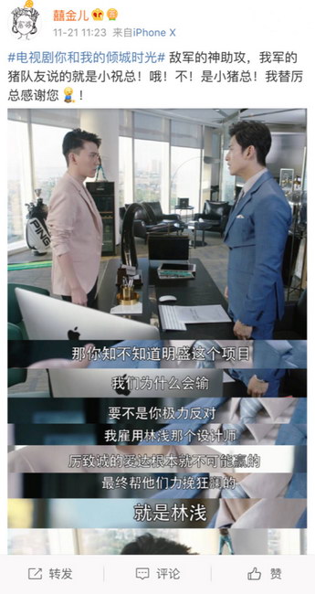 自祝晗冲(张正言 饰)带着私愤‘怼’走宁维凯(张峻宁 饰)的师妹林浅(赵丽颖 饰)之后,林浅就姻缘巧合的成为了祝氏企业最强劲的竞争对手——厉致诚(金瀚 饰)的得力武器。网友戏称宁维凯注定玩不过厉致诚,因为他有一个敌军的‘神助攻’——小祝总。城府颇深的宁维凯屡次破坏厉致诚的爱达公司,却都因小祝总的‘机智’搅局而屡次失败。所谓敌人的敌人就是朋友,更有网友笃定祝晗冲一定是对方派来的卧底,纷纷路转粉,并亲切的调侃他为 ‘小猪总’。