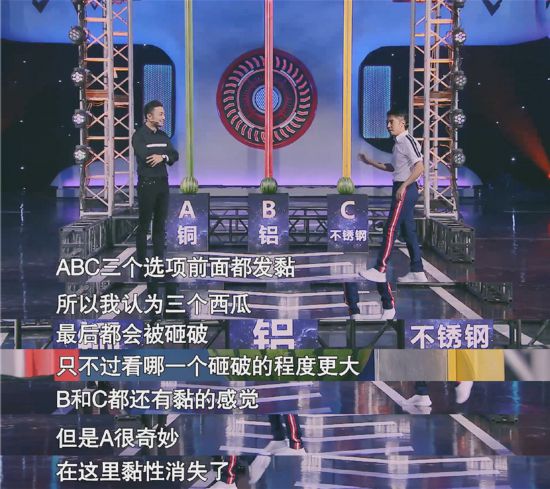 如何趣味解锁科学实验题目,撒贝宁便尝试了“侦探”大法。在楞次定律实验环节,撒贝宁发现三个选项前的实验区均有西瓜汁迸溅后的黏着感,便在实验区走来走去。最终通过选项A前消失的黏性,判定出正确的实验答案。