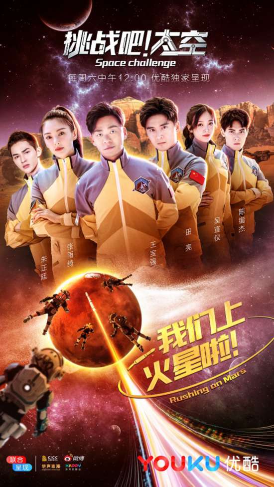 优酷首档太空探索生存挑战类节目《挑战吧太空》第七期将于本周六(12月29日)中午12点准时上线。“太空C计划”志愿者王宝强、张雨绮、田亮、吴宣仪、朱正廷、陈锴杰已经顺利完成“地球端”的各项训练以及考核。火星基地五人乘组名单即将在明日正式揭晓,志愿者们还将在1:1还原的火星模拟基地共同生活13天,而“火星端”的神秘面纱也将被360度无死角揭开,他们究竟还将遭遇哪些始料未及的“状况”呢?“太空粉”已经迫不及待地在官博催更:终于等来了火星基地的内容,可以跟志愿者们好好感受“太空生活”了。