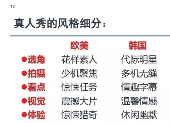 再加上欧美真人秀“举轻若重”(重视极端任务与人性险恶),而韩国真人秀“举重若轻”(少规则限制、多人物关系),相比之下,“韩流”更适应“情感大妈”与“细腻少女”的欣赏水准。