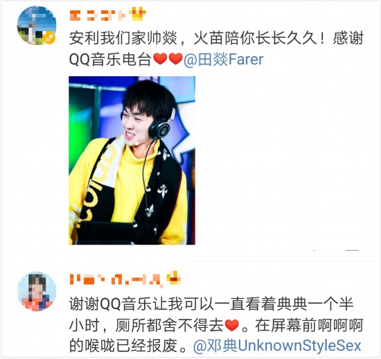 田燚、邓典粉丝在观看节目之后涌入《见面吧电台》官博留言