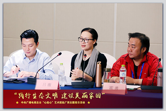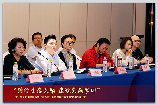 朱彤的话引起了在场很多人的共鸣。演员林永健表示,只有深入生活,扎根人民,才会真正有好作品出来。歌唱家吕薇表示从劳作体验活动中闻到了泥土的芳香,很感激通过“心连心”的活动感受到广西美丽的家园、美好的生活,未来将努力创作更多优秀的文艺作品,回报祖国与人民。歌唱家霍勇深情演唱了《祖国啊,慈祥的母亲》,家国情怀让人热泪盈眶。演员孙茜自问,“作为一个演员,我们能在环境保护中做什么?”她表示希望用自身的影响力影响更多人,身体力行、严于律己,推进精神文明的生态建设。