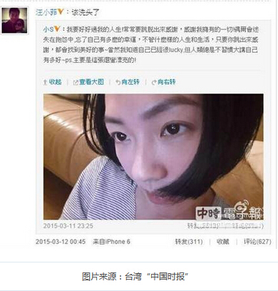 中新网3月12日电 据台湾“中国时报”即时消息,日前,小S一改平日搞笑形象,在微博发了一段感性的文字,感谢自己所拥有的一切,,坦言其实自己是来秀美照的。她的姐夫汪小菲看到照片后,吐嘈她“该洗头了”。