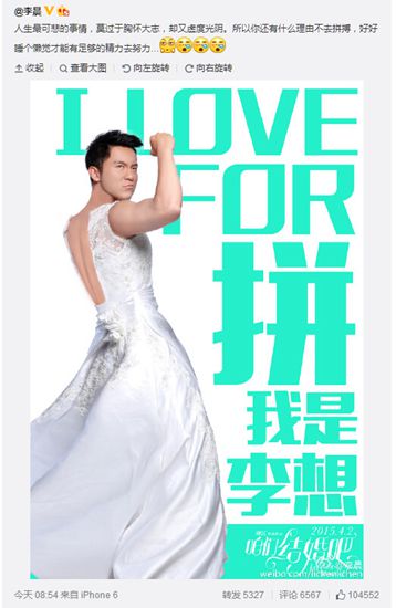 今早,李晨通过微博晒出一张自己穿婚纱的搞怪图片,他留言称,“人生最可悲的事情,莫过于胸怀大志,却又虚度光阴。所以你还有什么理由不去拼搏,好好睡个懒觉才能有足够的精力去努力”。