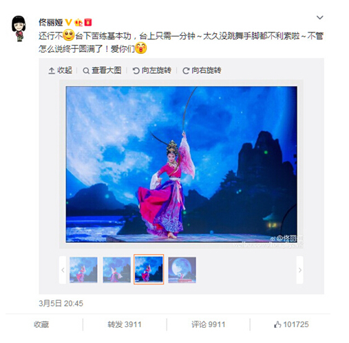 中新网3月6日电 昨日,在,电视台元宵晚会上,“春晚四美”、张杰等“春晚遗珠”悉数登台亮相。佟丽娅更新微博,晒出演出照片并留言“还行不?台下苦练基本功,台上只需一分钟。太久没跳舞手脚都不利索啦,不管怎么说终于圆满了!爱你们”。