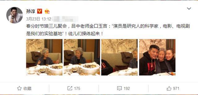 就在昨天23号的下午1点多的时候,孙淳发了一条微博,说:春分时节娘三儿聚会,吕中老师金口玉言:“演员是研究人的科学家,电影、电视剧是我们的实验基地”!徒儿们操练起来!并且放出了几张照片!