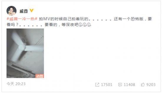 11月1日晚,戚薇通过微博上传动图,并称:“拍MV的时候自己拍着玩的。。。。。。还有一个恐怖版,要看吗?……要看的,等深夜吧!”