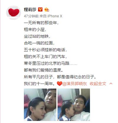 11月5日,程莉莎在微博晒出十一年前与郭晓东旧照,并发文纪念二人结婚十一周年。郭晓东也在该条微博下甜蜜回应:“十一年前,我还是个没有褶子的白衣少年。十一年后,我的褶子记录了我们的故事”。