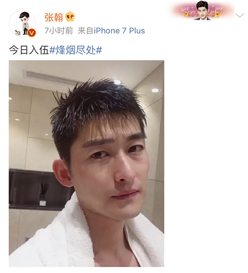 3月22日,演员张翰在某社交平台发布自拍并配文称:“今日入伍 #烽烟尽处#”,亲自官宣新戏即将开拍的消息。照片中,张翰一改往日的精致形象,头发已经剪成利落短发,似乎是为新戏特意改变了造型。自拍一经发布,大批网友在评论区留言表示:“又能看到张翰演硬汉了啊”、“期待你的新角色、新挑战!”