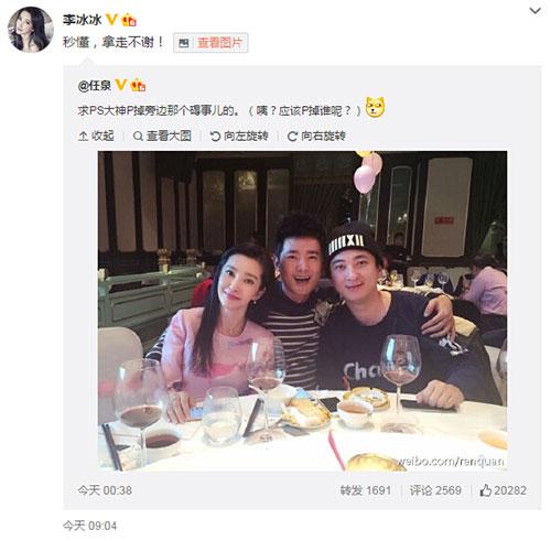 11月8日,任泉在微博上晒出与李冰冰和王思聪的合影,留言:“求PS大神P掉旁边那个碍事儿的。(咦?应该P掉谁呢?)”。照片中,任泉右揽王思聪,左抱李冰冰,开怀大笑。李冰冰转发了任泉的微博,并互动称:“秒懂,拿走不谢!”有网友调侃称要任泉和李冰冰二人在一起,“公孙策多年不娶,原来是为了楚楚啊”,“别秀恩爱了,在一起吧”。“国民女婿”王思聪帅气抢镜,被网友调侃,“P掉王思聪”。
