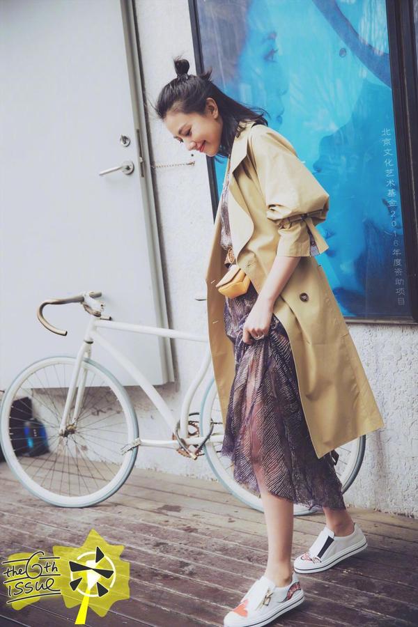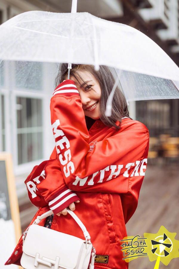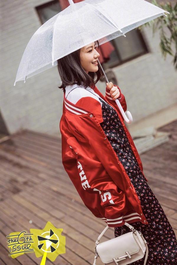 在浪漫的春雨天,打扮活力时尚的高圆圆彰显少女魅力。