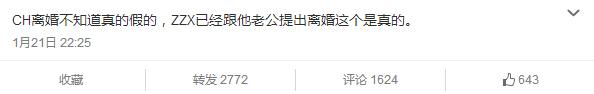 昨日晚间,又有网友爆料称“CH离婚不知道真的假的,ZZX已经跟他老公提出离婚这个是真的。”早前有网友发文祝贺张子萱和老公相聚四年,张子萱也转发了该条微博,并附文称:“低调~~低调”。