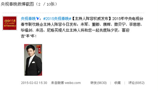 2月2日下午,2015央视春晚官方微博“央视春晚”发布春晚主持人阵容,朱军、董卿、康辉、撒贝宁、李思思、毕福剑、朱迅、尼格买提八位主持人将在除夕夜与大家见面。
