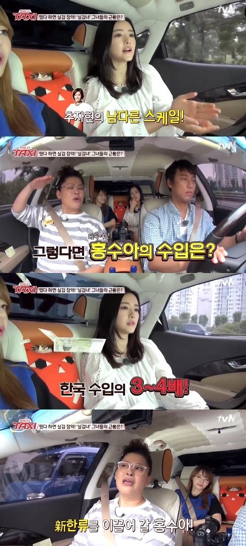 节目中,主持人提及比较早进军中国影视界的秋瓷炫[微博],并表示听说秋瓷炫在中国的片酬是一亿韩币(约54万人民币),但不知道是一集的片酬还是整部作品的片酬。洪秀儿表示,这是秋瓷炫一集的片酬,现在秋瓷炫在中国是女神级别的人物。主持人便问洪秀儿的级别是什么程度,洪秀儿坦言,是韩国收入的3-4倍,但如果和秋瓷炫相比则是婴儿水准。