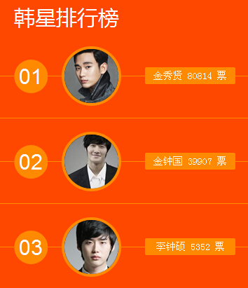 2014年,因韩剧《来自星星的你》走红的人气韩星金秀贤以80753票数领跑榜首,而韩星金钟国在韩国综艺节目《runningman》中凭借超高人气以39869票暂居第二,位列第三名的则是李钟硕,近日他出演的韩剧《匹诺曹》可谓红遍亚洲,成为关注的焦点。