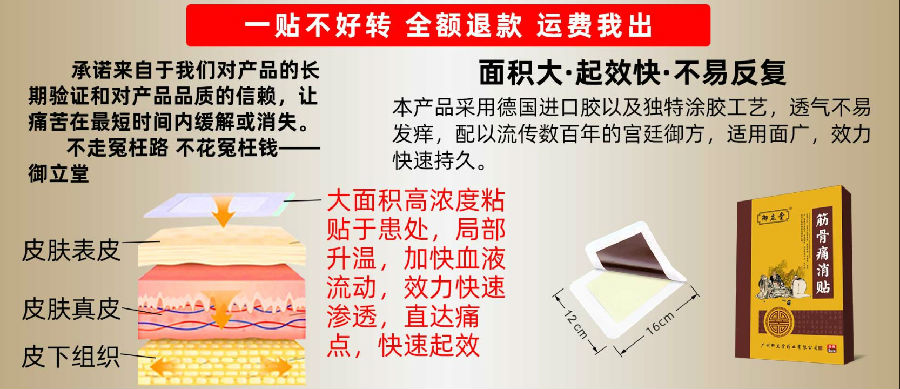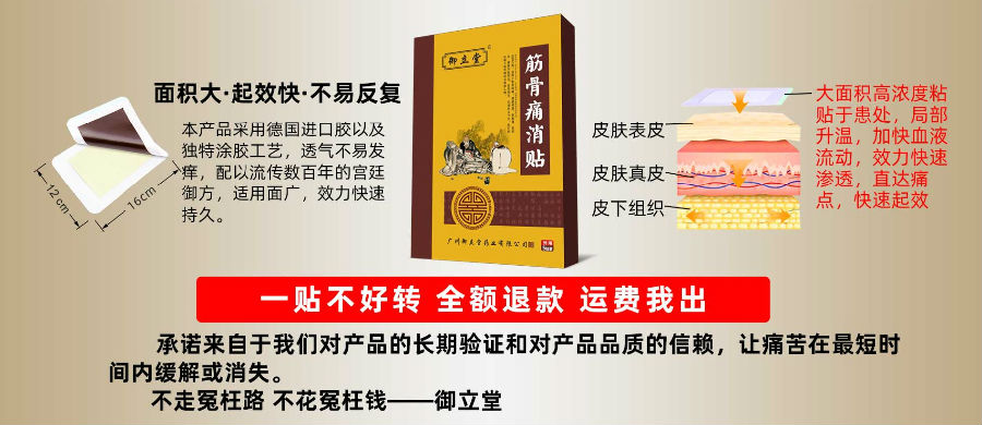 御立堂筋骨痛消贴疗效确切,物美价廉,无论你是自己用、送父母、送亲朋、送爱人,它都是非常实用的产品。对产品的长期验证和对产品品质的信赖让我们有信心向客户保证,使用御立堂筋骨痛消贴后,痛苦会在最短时间内缓解或消失,绝不会让你走冤枉路、花冤枉钱。身体乃革命的本,只有在日常生活中对自己的身体负责,在未出问题时小心防范,在出了问题后悉心调理、治疗,才能得到一个健康的身体,才能最终收获一个幸福快乐的生活