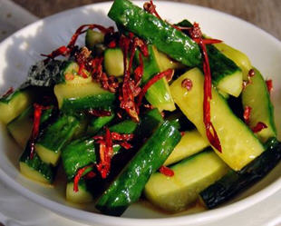 做法:将黄瓜洗净放人缸内,一层瓜一层盐,并均匀地洒少量盐水,当天腌三至五小时后倒缸一次,以后每天一次,连续倒缸四次后可食用。如需长期贮藏,将黄瓜捞出放入新的盐水中,压紧,置阴凉处存放。