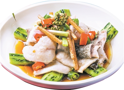 一条2.25公斤的大头鱼,经处理后所有鱼骨皆被师傅除去。这些鱼骨被用来熬汤,鱼肉则大有用处,用姜、椒麻来调味。在顺德当地,无骨鱼已是常见菜式。店内黄师傅在传统之上加入时下人们追捧的味型——麻。麻来自青花椒,它是在即将上菜的,一刻,同炸姜、葱和豉油被一起加上去的,末了黄师傅撒上一把热油,将炸姜和花椒的味道充分释放出来。鱼看似清蒸,实际上用了“拉嫩油”的方式。起鱼肉很考验师傅的功夫。一条2.25公斤的大头鱼,最终只有11块鱼片。垫在无骨鱼片下的丝瓜充分吸收了大头鱼的风味,它乃精华所在。