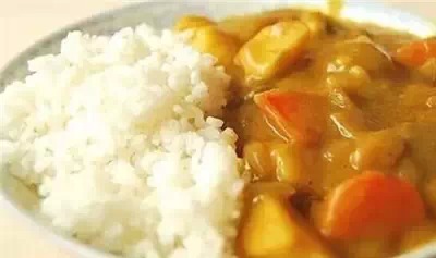 把胡萝卜、土豆、火腿肠切成丁,放在碗里,加入咖喱快,用水没过食材,拿保鲜膜盖上,并在上面戳几个小眼儿,中火微波10~15分钟,然后与米饭搅拌在一起即可。