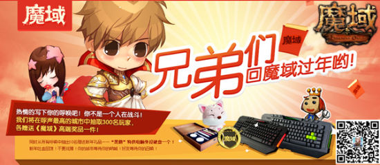 2014年1月6日——1月24日期间,《魔域》特别推出 “呼唤好友回《魔域》过年” 新春回馈活动,英雄可以通过页面,使用文字、语音,为昔日的手足兄弟进行呼唤与祝福,邀请他们回归《魔域》,再创传奇。而官方也将统计呼声,的城市,来派发新年礼品!
