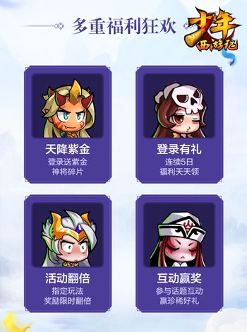 此外,《少年西游记》四重福利狂欢今日正式开启,玩家参与天降紫金、登录有礼、活动翻倍、互动赢奖四重活动,即可获得,紫金神将碎片、紫金宝物养成资源、紫金法宝碎片、海量元宝等,奖励。