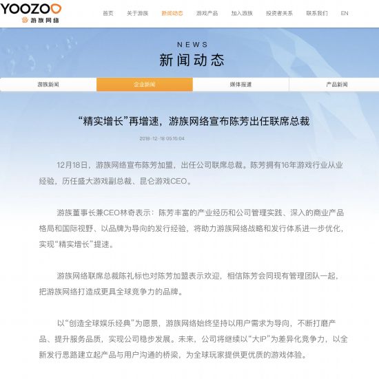 12月18日,游族网络官方宣布陈芳加盟,出任公司联席总裁。
