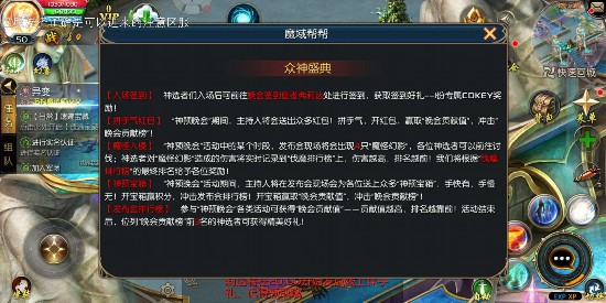 为了感谢玩家多年来的支持,官方特意在资料片上线当日的晚20点,通过游戏、YY以及斗鱼这三大渠道,召开 “众神盛宴”晚会,以独特创新的形式,突破互联网娱乐传统,让参与者从线上的游戏、YY、斗鱼直播这三种方式来参与此次圣典。内地人气女歌手童可可、游戏节目主持人、游戏节目制作人七夜娃娃在晚会中共同担任主持,全程亮点、福利不断,频繁引爆全场。