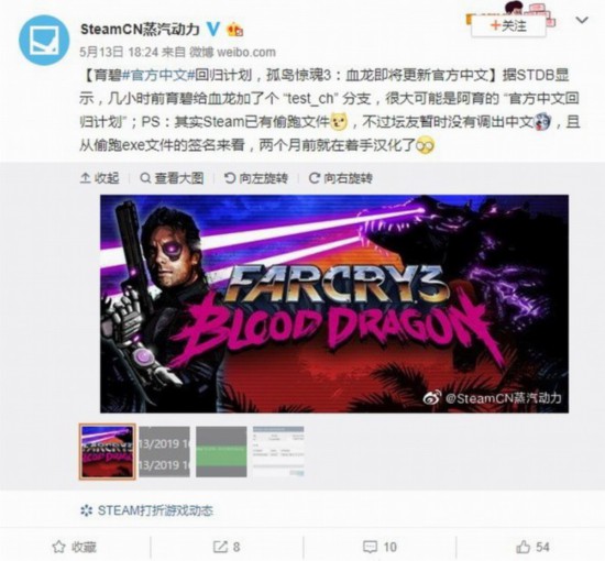 近日蒸汽动力官微@SteamCN蒸汽动力在微博上发布消息,先前网友breastsexy在STDB中发现的《孤岛惊魂3:血龙》即将更新官方中文的消息确实有一定可信度。
